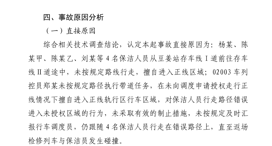 2025年9月13日23时25分左右,绍兴轨道交通2号线一列回站检修的空车在坦渡站至斗江站下坡路段撞上4名保洁人员,造成3人死亡、1人重伤。 12月25日,浙江省发布《绍兴市“9·13”轨道交通2号线列车相撞事故调查报告》。该报告由浙江省人民政府事故调查组调查撰写。经调查认定,绍兴市“9·13”轨道交通特大事故系因涉事企业未认识到安全风险和控制、违反员工安全操作规程,造成3人死亡、1人重伤的生产安全事故。报道称,当天23时23分01秒,以02003次列车车长郑为首的4名保洁人员从车站一巷步行过来。葛线至斗江站存库线二巷继续对02005次列车进行清洗。下车后,4名保洁人员没有按照指定路线,非法进入下行主轨道区域。 02003次列车列车长郑某见状,无法有效制止,尾随保洁人员。 23时25分12秒,行走在下行干线末端的02003次列车列车长郑某发现列车驶近,遂跳过隔墙逃走; 14-16秒,02004次列车在斗江站下行道岔区域与4名保洁人员相撞。报告评估,造成事故的直接原因是四名保洁人员没有按照规定路线,未经允许进入主轨道区域; 02003次列车列车控制员郑某未按规定路径执行引轨任务,进入主轨未经调度员许可擅自进入区域。在行车区域,未采取有效措施防止保洁人员走错路线进入非授权区域,也未按要求及时向行车调度员报告。他们仍然跟着走错路的四名清洁人员,直到返回的维修列车撞上了清洁人员。间接原因包括绍兴轨道交通集团分配的步行路径不合理。有电缆、配电箱、备用钢轨等设施设备。通道最小处有30厘米,交通困难,导致相关工作人员有按照设定路径不迟到的习惯。此外,这四名保洁人员是浙江亚太酒店物业服务有限公司分包商绍兴精明物业服务有限公司的劳务派遣人员。报道认为,绍兴轨道中天集团未对现场保洁公司合同履行情况进行监督,未对浙江亚太酒店物业服务有限公司其他违约行为进行有效监督;浙江亚太酒店物业服务有限公司未针对斗江站的特殊情况对保洁人员进行针对性培训,保洁人员未按要求穿戴反光背心等安全装备。文字|记者范涵月摄|绍兴市“9·13”轨道交通2号线列车相撞事故通报