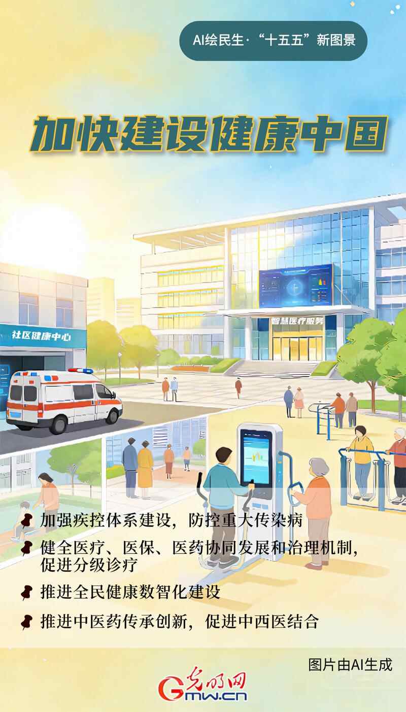 《中共中央关于制定国民经济和社会发展第十五个五年规划的建议》(简称《建议》)明确提出,实现人民对美好生活的向往是中国式现代化的出发点和落脚点。 《建议》提出了就业、收入、教育、社会保障等民生领域的一系列措施。从青年就业到老年人养老,从儿童教育到家庭医疗,这些经济红利让发展成果更加平等地惠及人民。加快建设健康中国 ●实施健康优先发展战略,完善健康促进政策和制度体系,增强全民健康运动成效,提高人民平均寿命和健康水平。 ● 加强公共卫生能力,加强建立疾病控制体系,防控重大传染病。 ● 完善医疗、医保、医药协调发展管理机制,推进分级诊疗。 ● 以公共卫生为导向,深化公立医院人员、服务价格、薪酬制度和综合监管改革,强化县区和基层医疗机构运行保障。 ● 优化医疗机构功能定位和布局,实施医疗卫生基础设施强化工程,推动国民健康数字化、智慧化建设。 ● 加强慢性病综合防治,发展预防、治疗和健康管理全链条服务。 ●全面提高应急急救、血液保障和应急处置能力。 ● 强化能力医疗卫生队伍建设和发展方式。 ● 推动中医药传承创新,促进中西医结合。 ● 支持创新药物和医疗器械研发。 ● 加强精神卫生和心理健康服务。策划/制图:袁庆